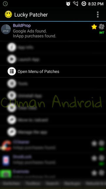 #1. Buka aplikasi Lucky Patcher, kemudian pilih aplikasi yang ingin teman patch, kemudian teman pencet aplikasinya (cukup pencet sekali saja), maka sehabis di pencet akan muncul hidangan menyerupai ini.Lalu, kalau menunya sudah muncul, teman dapat pilih yang "Open Menu of Patches"